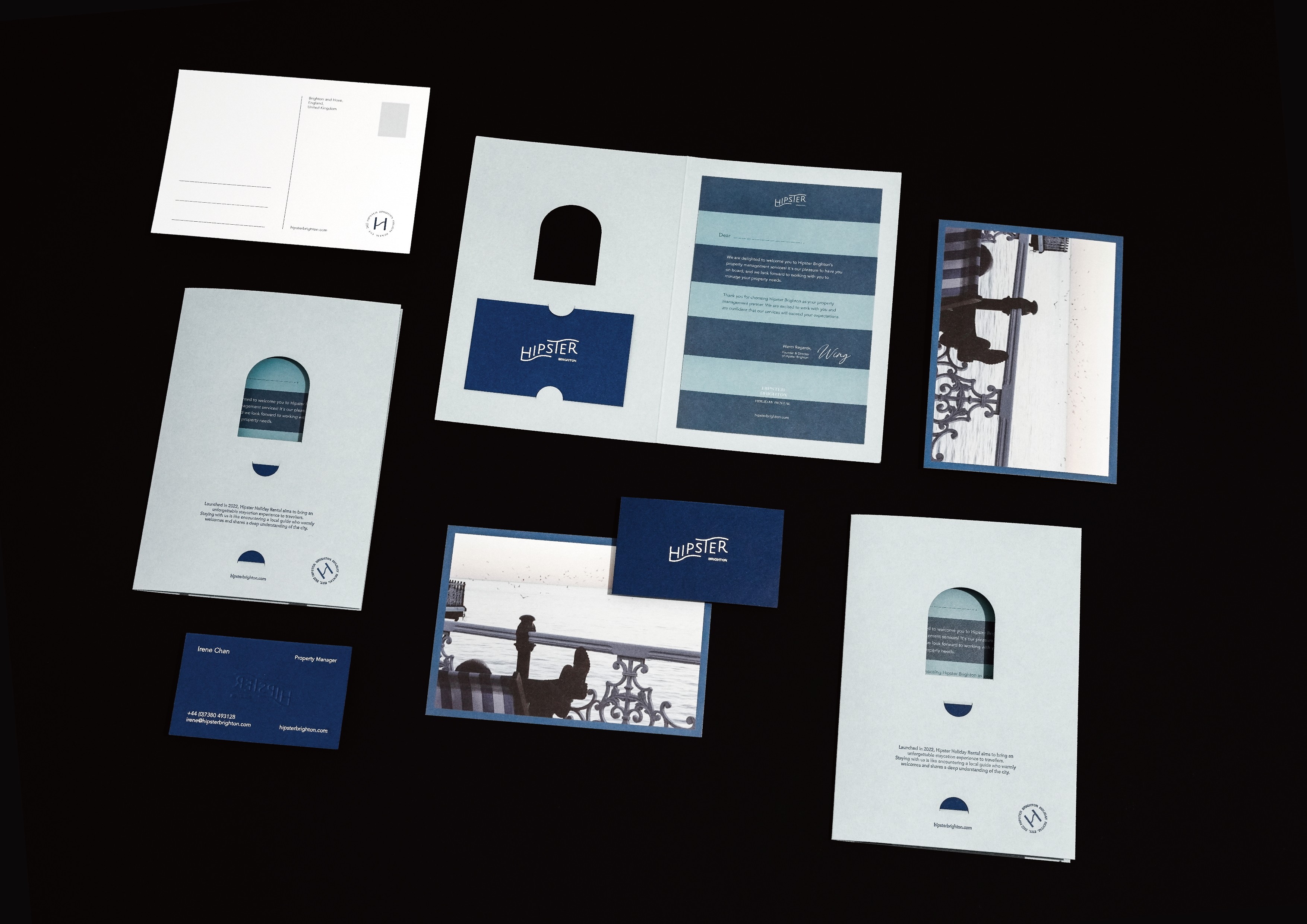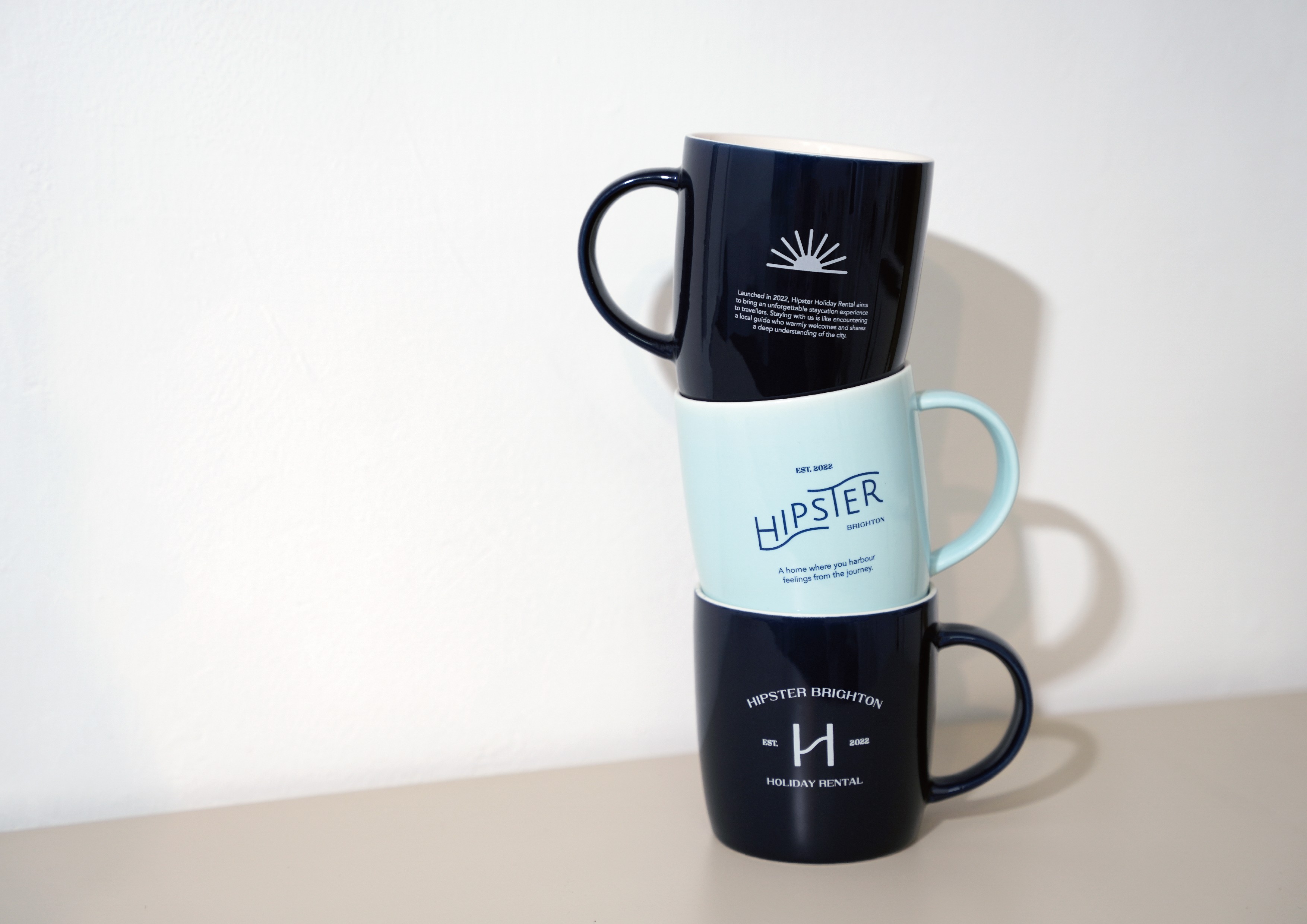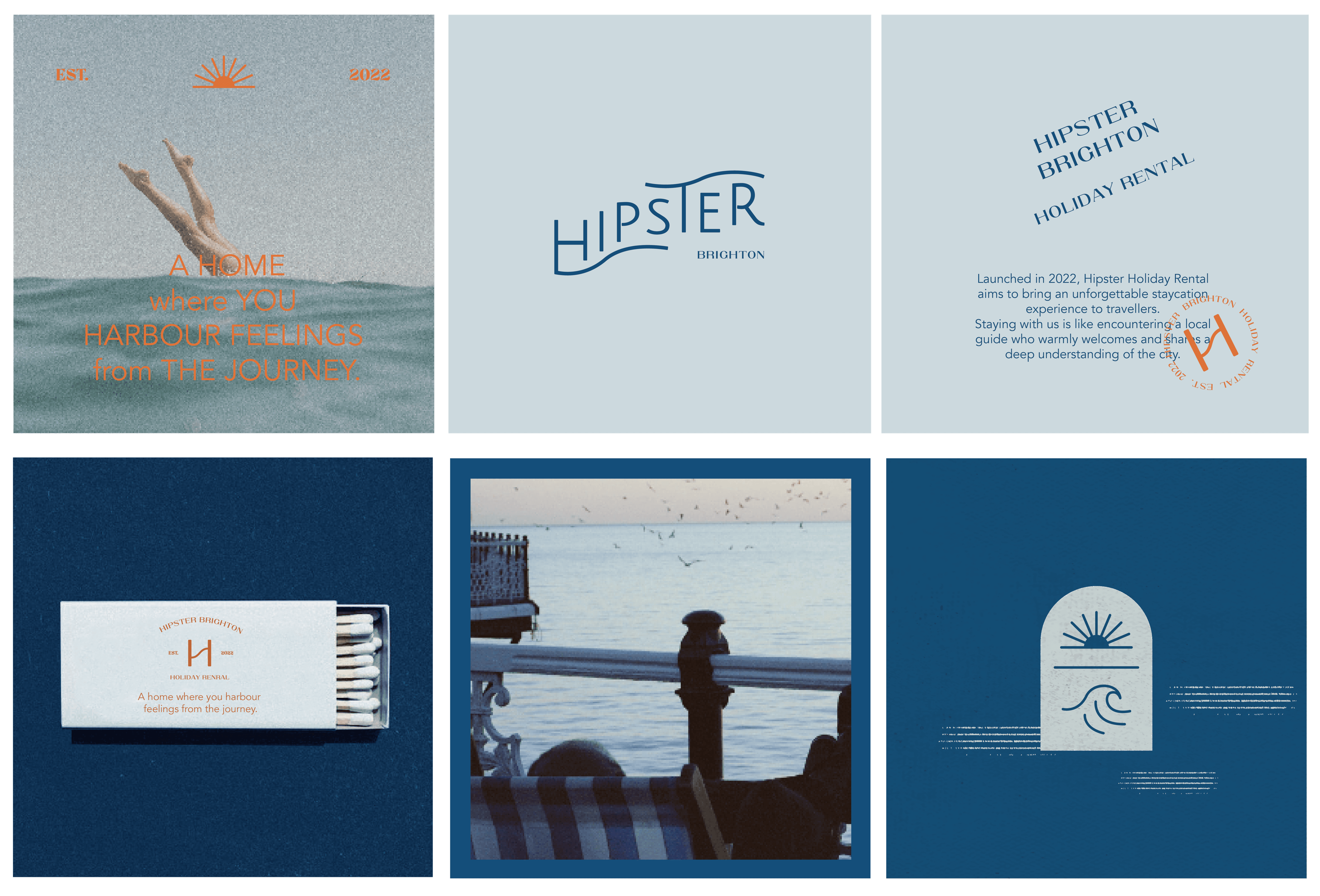 The logotype combines clean, minimalist sans-serif typography with contrasting thick-and-thin serif details, reflecting Hipster Brighton’s contemporary yet timelessly warm character. The playful arrangement of letter heights evokes a sense of lightness and joy, as if the typography itself were dancing in the gentle sunshine and soothing sound of ocean waves. The brand colors draw inspiration from Brighton’s sea, featuring layered shades of blue, accented with sunset orange and sandy beige. The brand illustrations extend naturally into motifs like seagulls, sunsets, and ocean waves. We’ve also created a range of merchandise—such as postcards, keychains, and mugs—not only to enrich the brand image but also to offer travelers a more memorable, immersive experience. Logotype 以簡練的黑體作為基礎、搭配有著粗細對比的襯線字,帶出 Hipster Brighton 當代中卻不失溫暖經典的氛圍。整體利用高底起伏的字體排列營造輕鬆愉快的心情,律動感的字體讓整體更像是在暖陽與寧靜海聲中隨之起舞。 品牌色以Brighton海洋的藍為主,帶出不同層次的藍色調,加以用夕陽橘色、沙灘米色作為點綴。品牌圖案延伸出海鷗、夕陽、海浪作為輔助,我們更製作出不同的周邊商品,如同明信片、鑰匙圈、馬克杯等等,增添品牌的形象外也希望帶給旅人更多的體驗。
